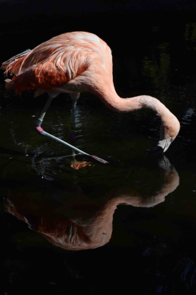 Flamingos stand side by side, one leg up in a typical Flamingo pose. A Moment of isolation occurs with a bill dipped to the water, creating an uncertainty on where the bill ends and the water begins. As you look into the depth of the water, you see the ripple of a moving foot and the meeting between a reflection and the reflected.