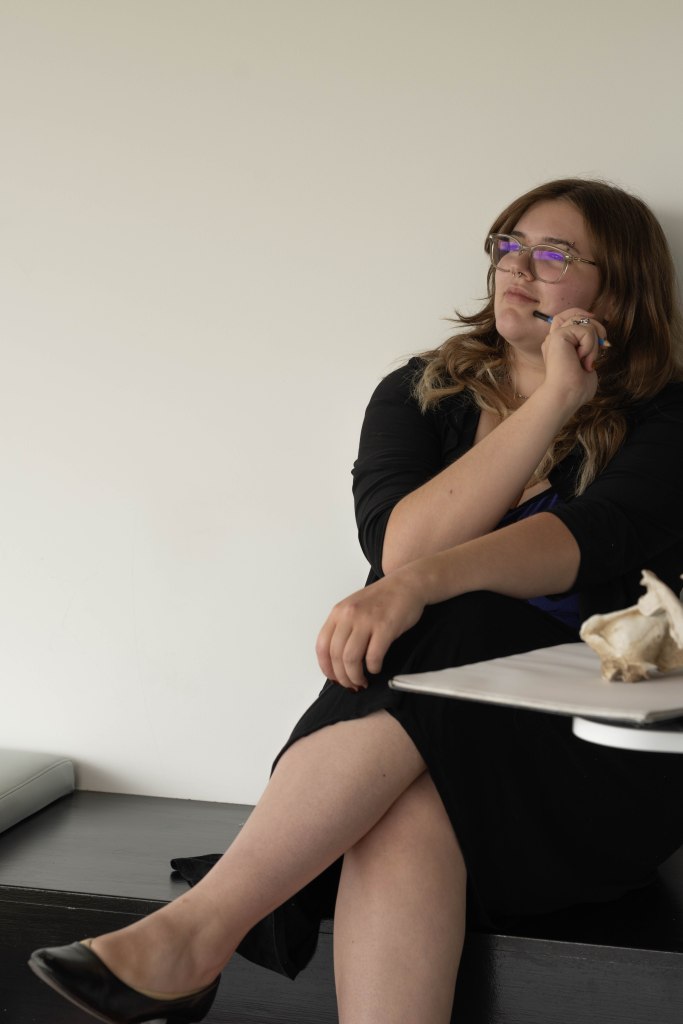 For this photo, I photographed a classmate, and friend, LeAnn Johnson. Johnson enjoys artwork, though doesn’t get a lot of chances, is spiritual, enjoys dancing and has an overall fun personality. As such, I wanted to take a photo of her working on art in clothing that she felt represented her. As I was struggling with my GoDox set, I decided to take this environmental shot of LeAnn in natural lighting, The area we used is in building 32 of SFCC and includes a lot of window light and cute little bird perches, human sized. I believe the natural light and shadows adds to this feeling, as well.